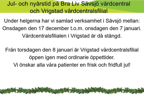 Jul- och nyårshelgerna närmar sig och eftersom vår personal också vill fira med sina nära och kära så har lite avvikande öppettider på vårdcentralsfilialen i Vrigstad.